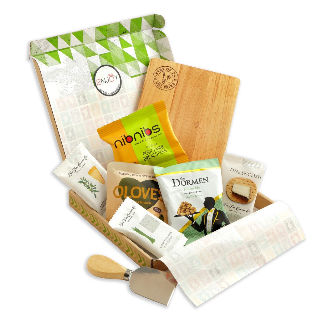 A delightful gift of savoury snacks perfect to pair with whatever cheese your loved one likes! Pistachios, olives and an assortment of crackers are delivered alongside a mini cheese board and knife, fitting through your recipient's letterbox.This hamper contains 7 items: Mini Cheese Board & Knife Dormen’s Pistachios (40g) Oloves Lemon & Rosemary (30g) Nibnibs Pesto Mini Breadsticks (14g) Fine Cheese Co. Rosemary Crackers For Cheese (15g) Fine Cheese Co. Chive Crackers For Cheese (15g) Fine Cheese Co. Extra Virgin Olive Oil & Sea Salt Cracker Pack (15g)